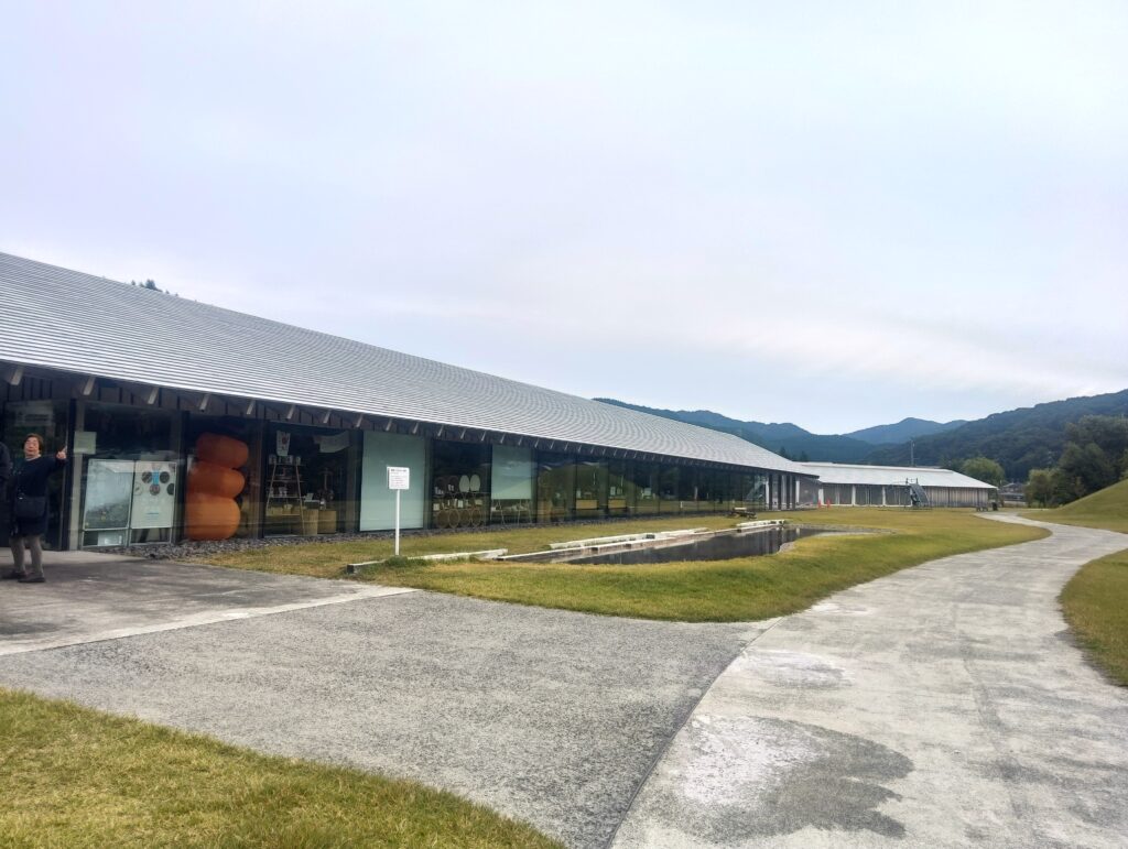 ここは、世界的建築家・隈研吾氏が設計を手掛けた施設です。地域の伝統工芸「曲げわっぱ」から着想を得たという、木材を多用したリング状の構造が特徴的。国立競技場の設計者としても知られる隈氏の、「その土地の環境や文化に溶け込む建築」というコンセプトが、大湯温泉郷の自然豊かな景色に見事に調和していました。