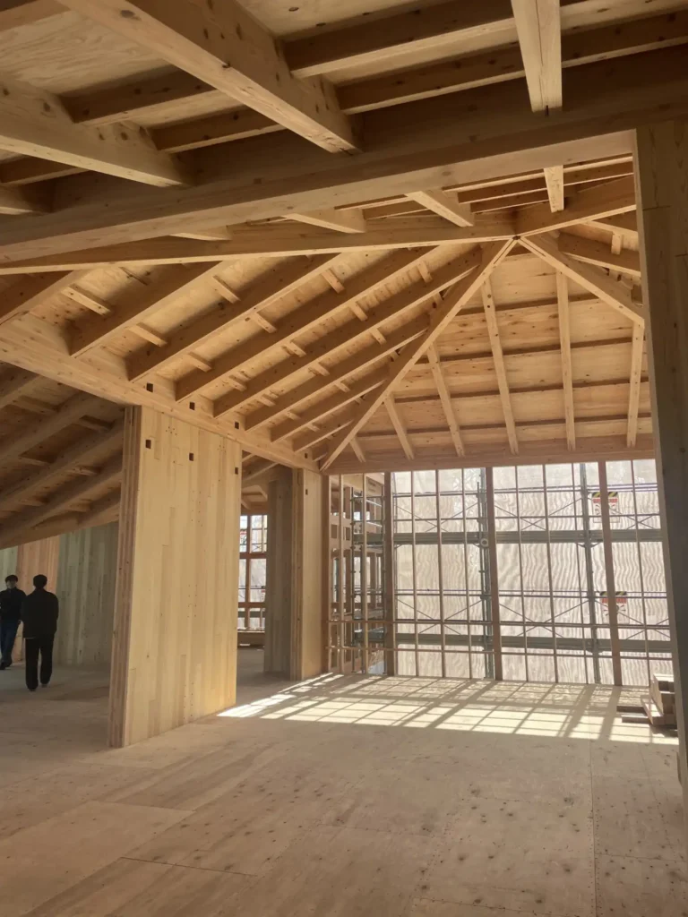 約50㎥ものCLTパネルを構造の核とし、それを軸組みと巧みに組み合わせることで、木造建築の新しい表現の幅を切り拓いています。実際に現場に立つと、CLTの圧倒的な木の質感と、それを支える軸組の軽やかさが絶妙なバランスで共存しており、その迫力に圧倒されました。
