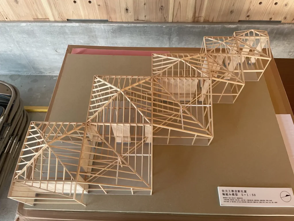 現場の細部を拝見して改めて驚かされたのは、その施工精度の高さです。宮城県産木材の積極的な利用を図り、宮城県内プレカット会社とも連携しながら自社で一貫して管理・実践できる佐元工務店さんだからこそ、この複雑かつ繊細な構造が形になるのだと感じました。
